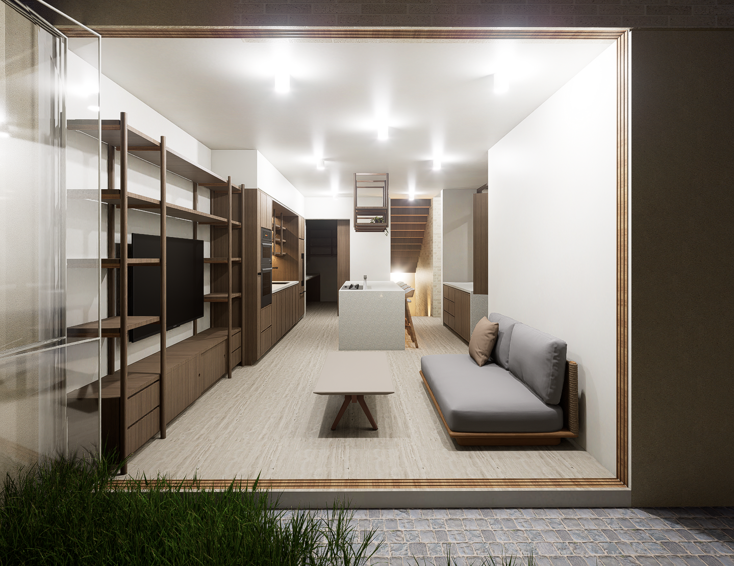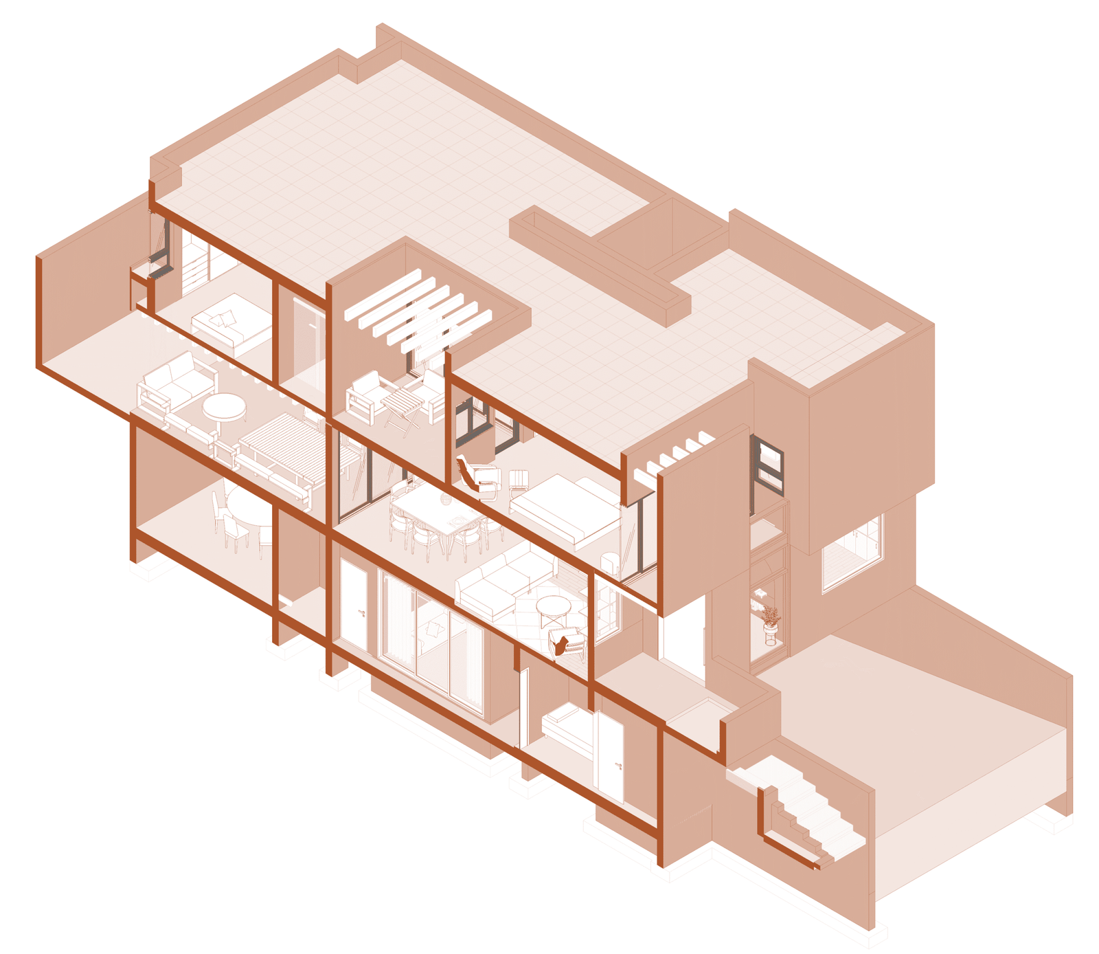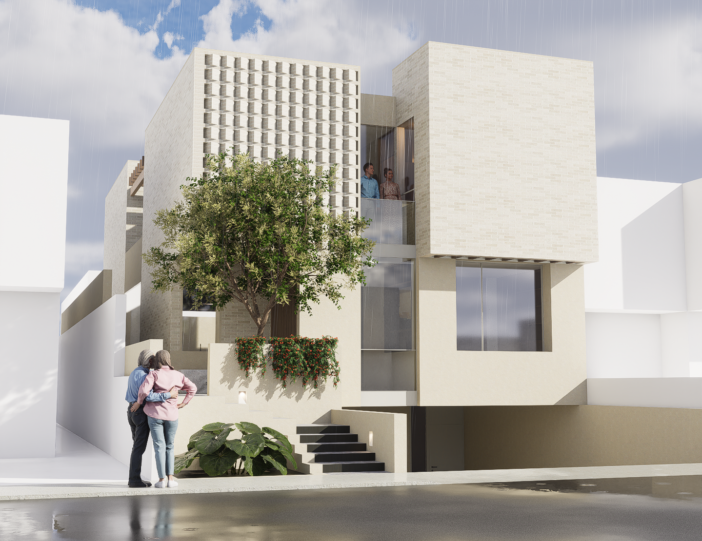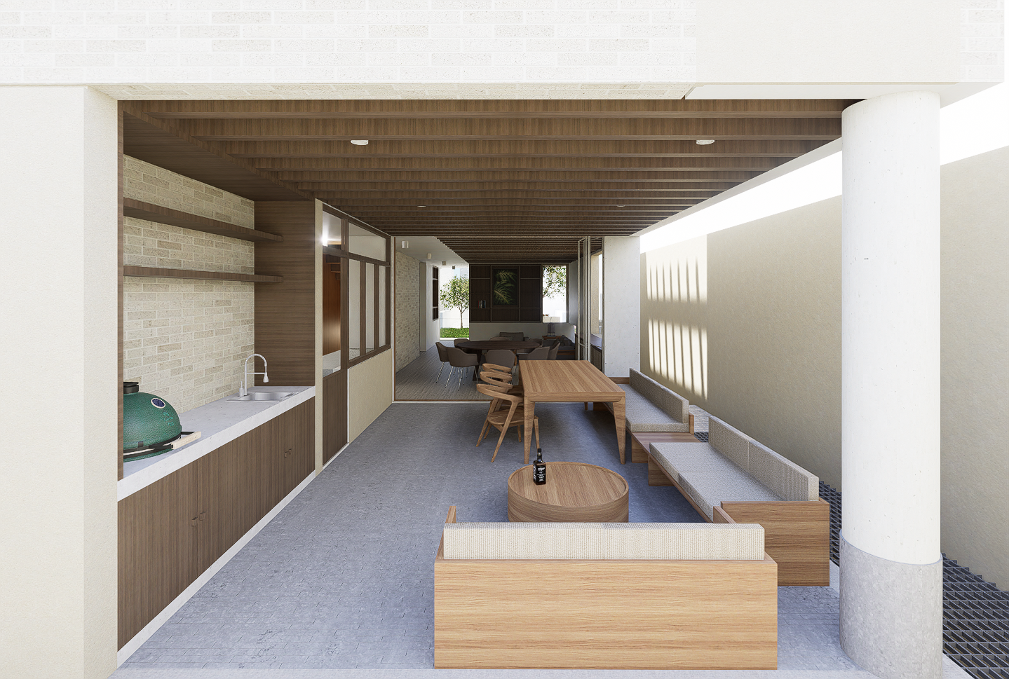 La habitación principal se construye en torno a dos patios interiores que regulan la temperatura y permiten una ventilación cruzada constante, generando privacidad sin perder apertura. Las habitaciones secundarias también se benefician de esta estrategia pasiva, reduciendo la necesidad de sistemas mecánicos y favoreciendo el confort térmico natural. La cocina, separada del área social, se conecta con la terraza y se convierte en un espacio articulador entre lo cotidiano y lo colectivo.