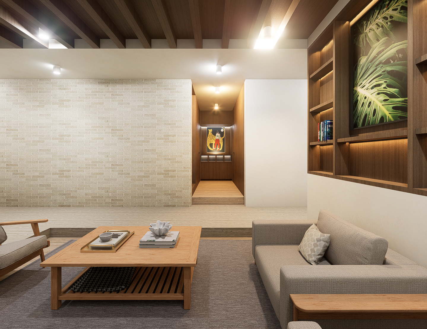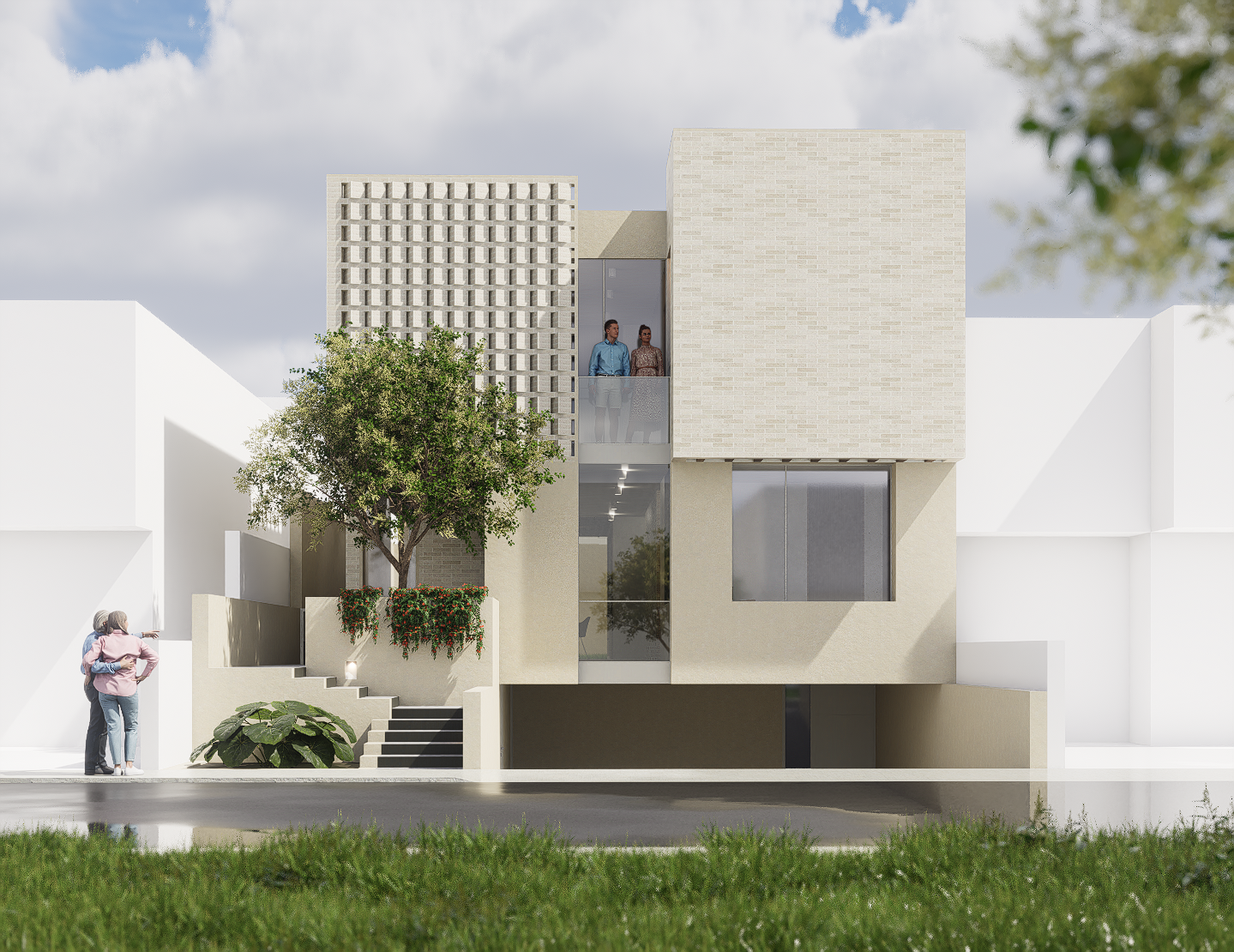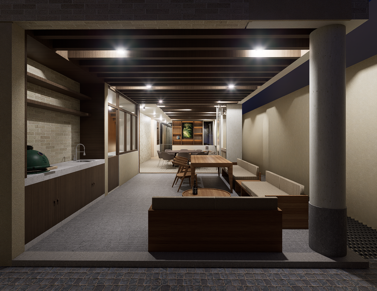 La habitación principal se construye en torno a dos patios interiores que regulan la temperatura y permiten una ventilación cruzada constante, generando privacidad sin perder apertura. Las habitaciones secundarias también se benefician de esta estrategia pasiva, reduciendo la necesidad de sistemas mecánicos y favoreciendo el confort térmico natural. La cocina, separada del área social, se conecta con la terraza y se convierte en un espacio articulador entre lo cotidiano y lo colectivo.