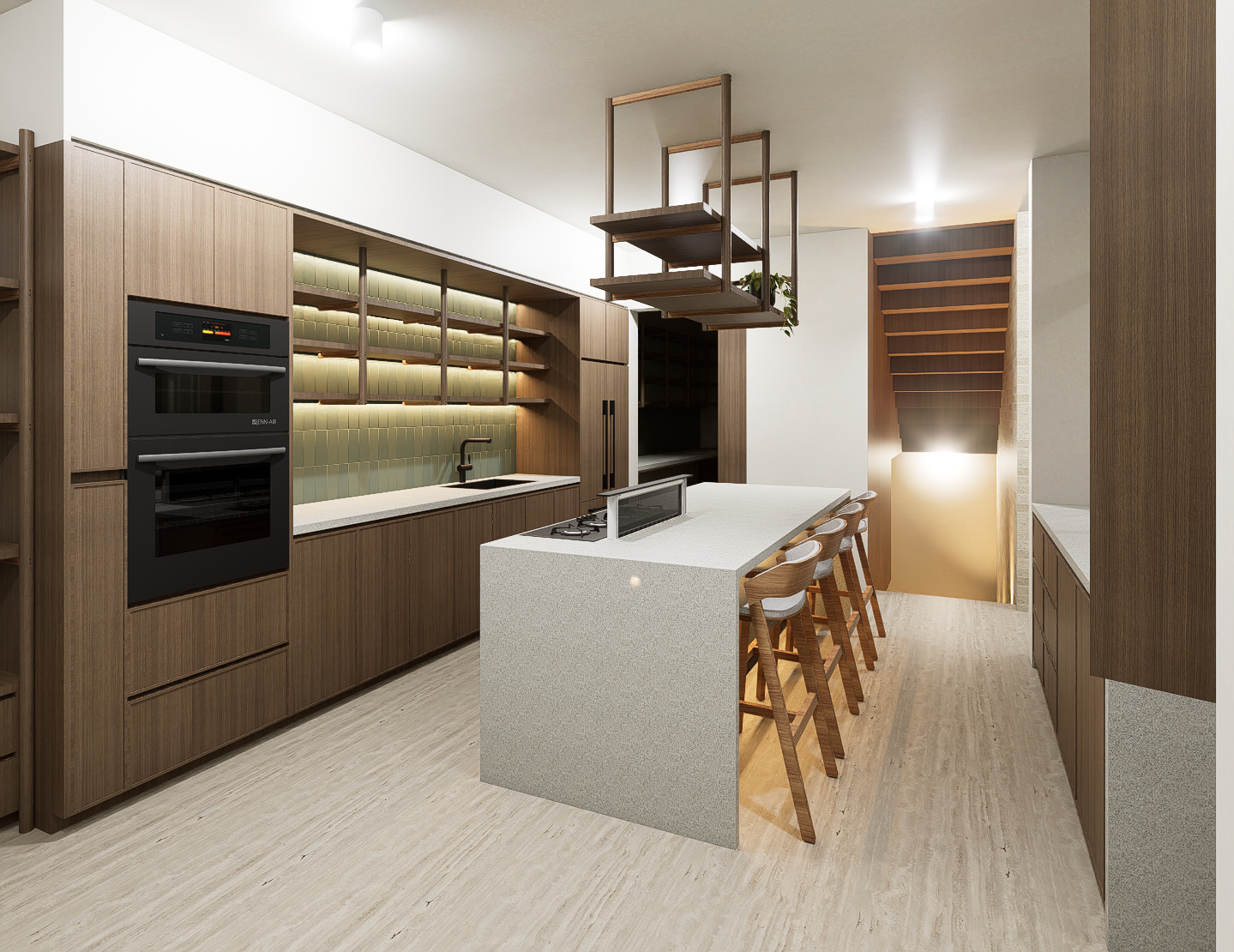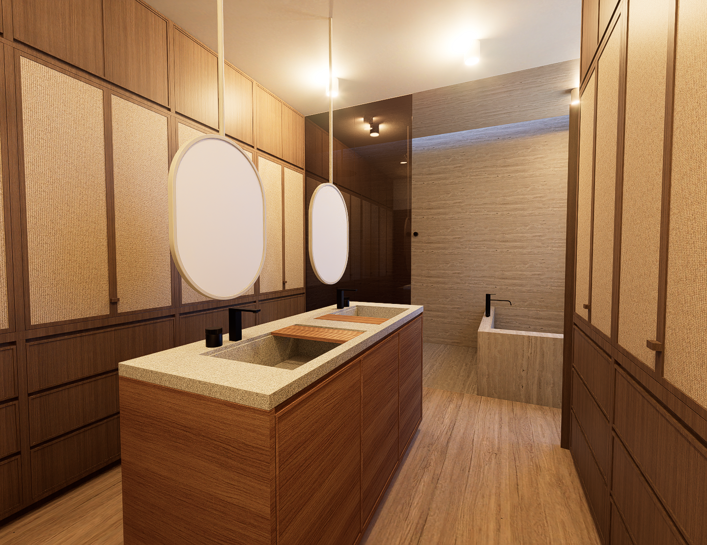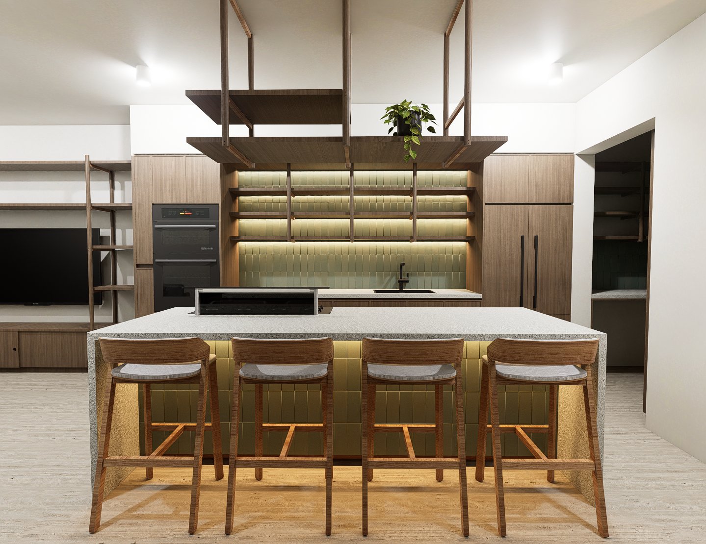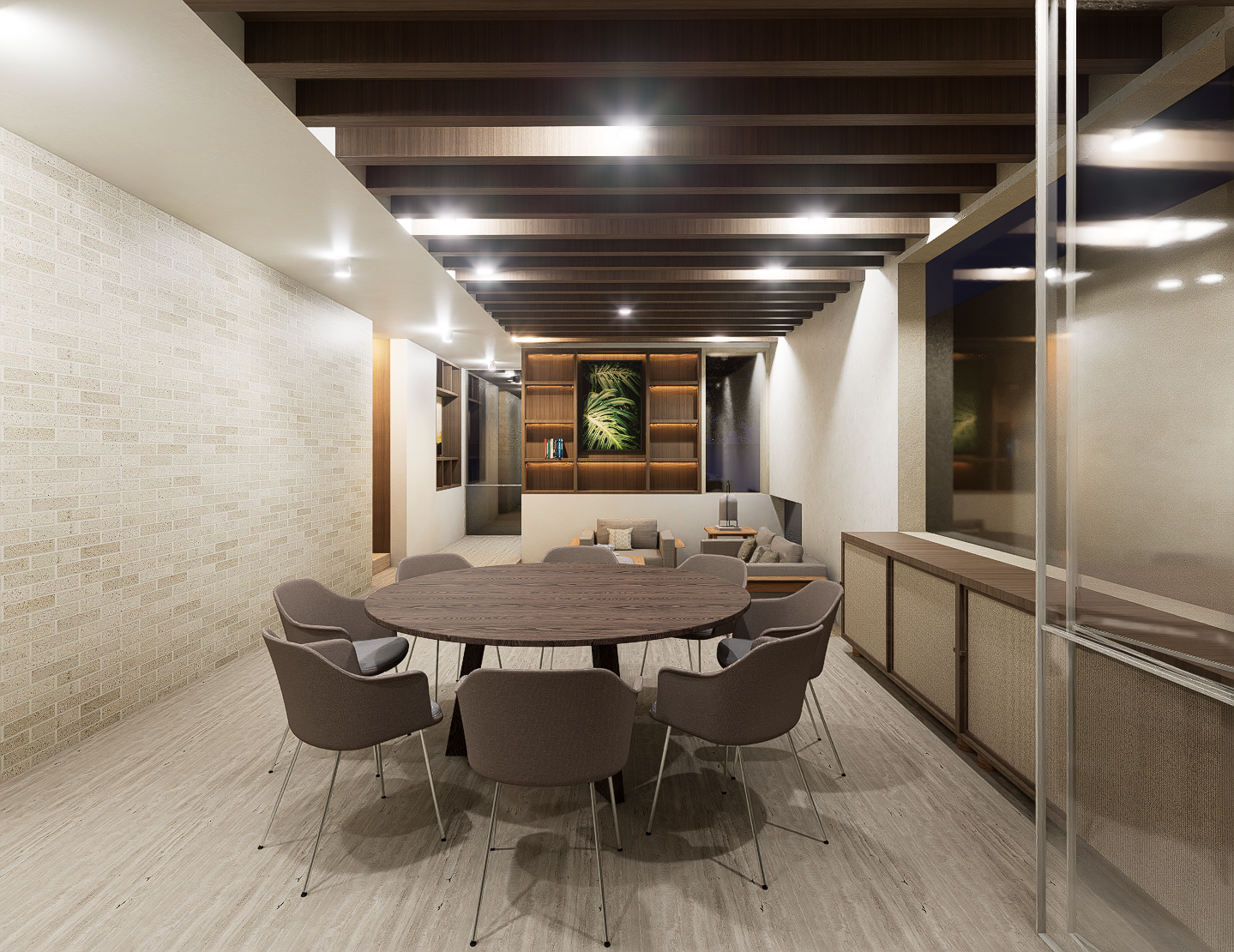 La habitación principal se construye en torno a dos patios interiores que regulan la temperatura y permiten una ventilación cruzada constante, generando privacidad sin perder apertura. Las habitaciones secundarias también se benefician de esta estrategia pasiva, reduciendo la necesidad de sistemas mecánicos y favoreciendo el confort térmico natural. La cocina, separada del área social, se conecta con la terraza y se convierte en un espacio articulador entre lo cotidiano y lo colectivo.